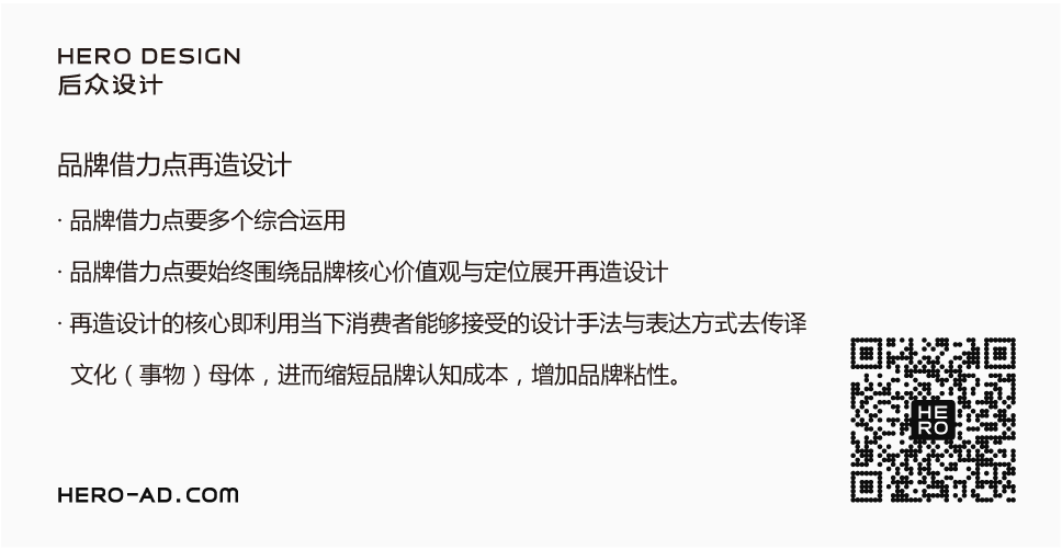 在進行品牌借力點再造設計時,還應值得注意的一點是“當代的設計手法與表達方式”。借力點只是文化(事物)母體,是公共舊有資產(chǎn),是經(jīng)過歷史沉淀下來的公共資源,而不是品牌價值的最終呈現(xiàn),針對“母體”我們要進行再造設計,而再造設計的核心是利用當代或當下消費者能夠接受的設計手法或表達方式去傳譯我們的公共資源,本質(zhì)在于傳承與翻譯,文化(事物)可以是舊的,但表達一定是新的,只有這樣才能夠做到縮短消費者對于品牌認知成本的同時增加品牌粘性,吸引消費者重復消費。